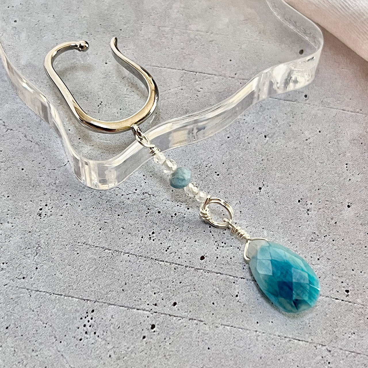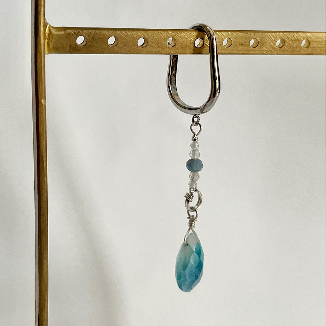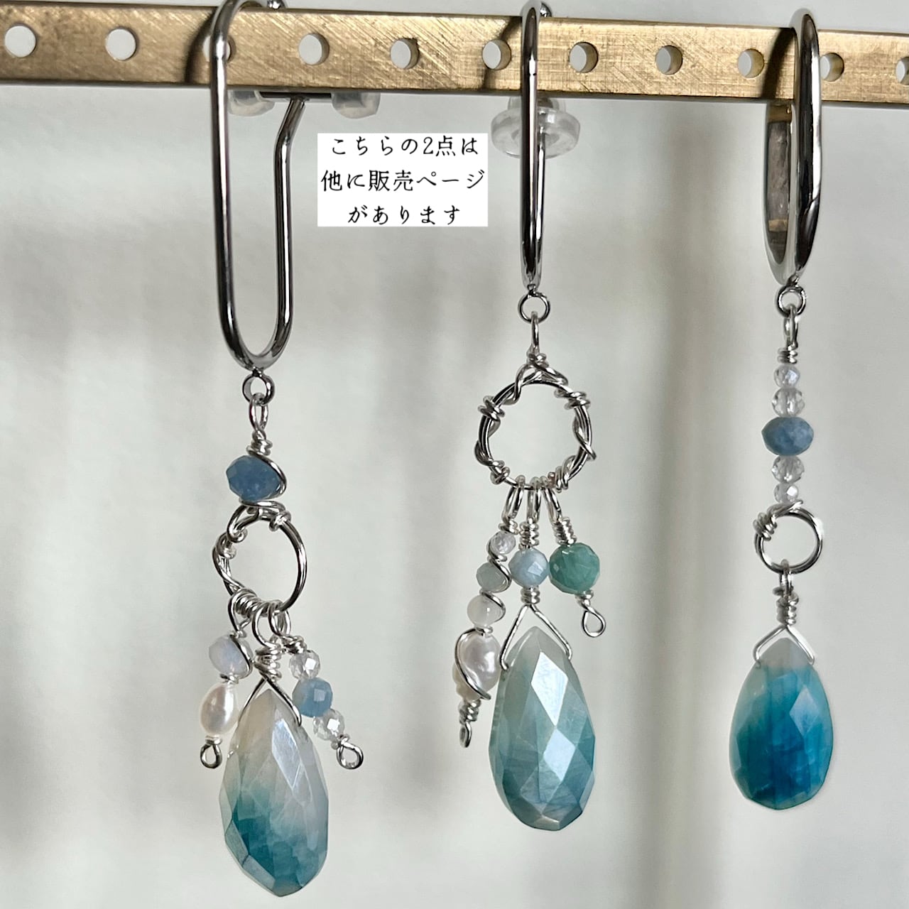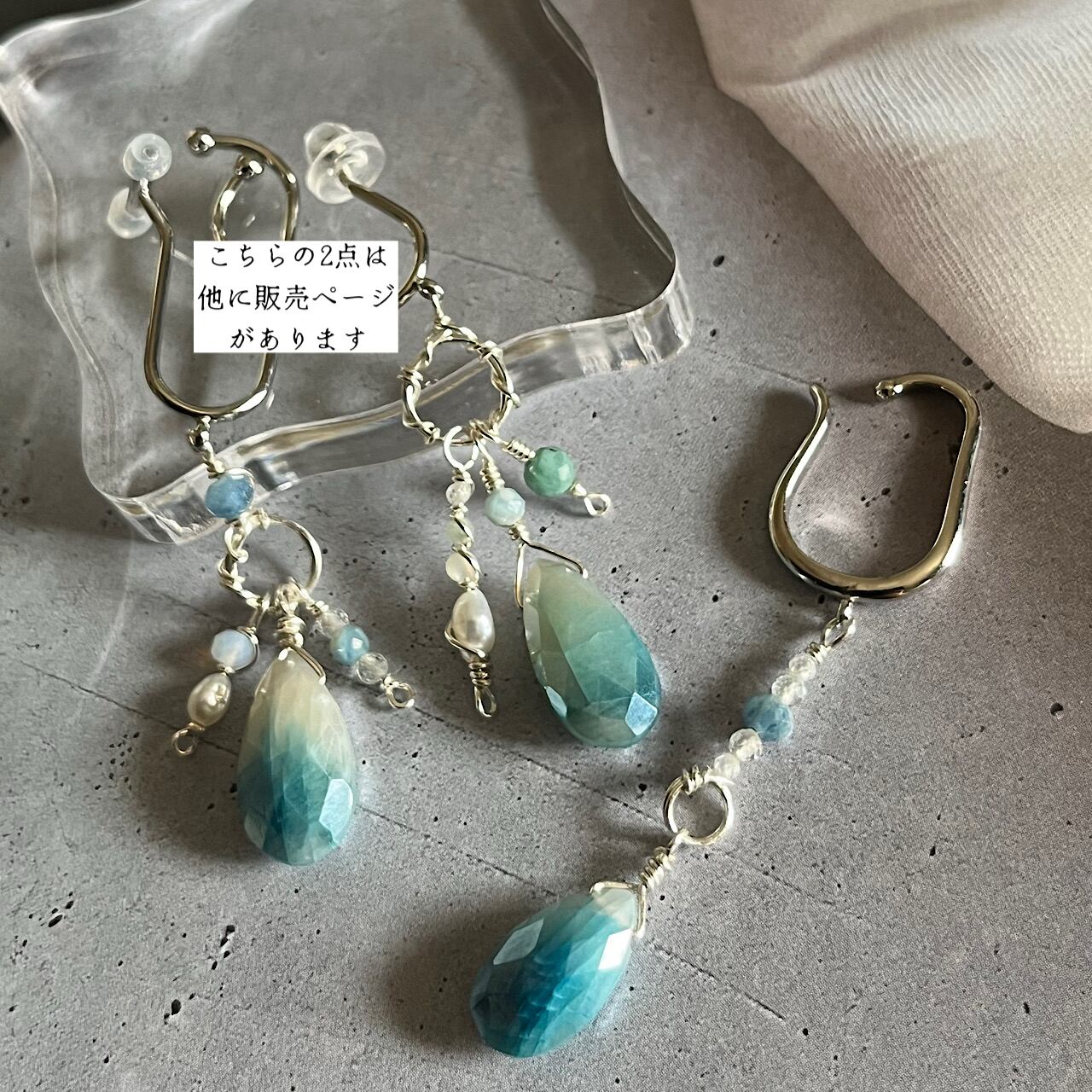 ペアシェイプ ブリオレットカットのバイカラームーンストーン(染色,コーティング仕様)をメインにディープブルーアクアマリンなどを組み合わせた涼しげなイヤーカフです。