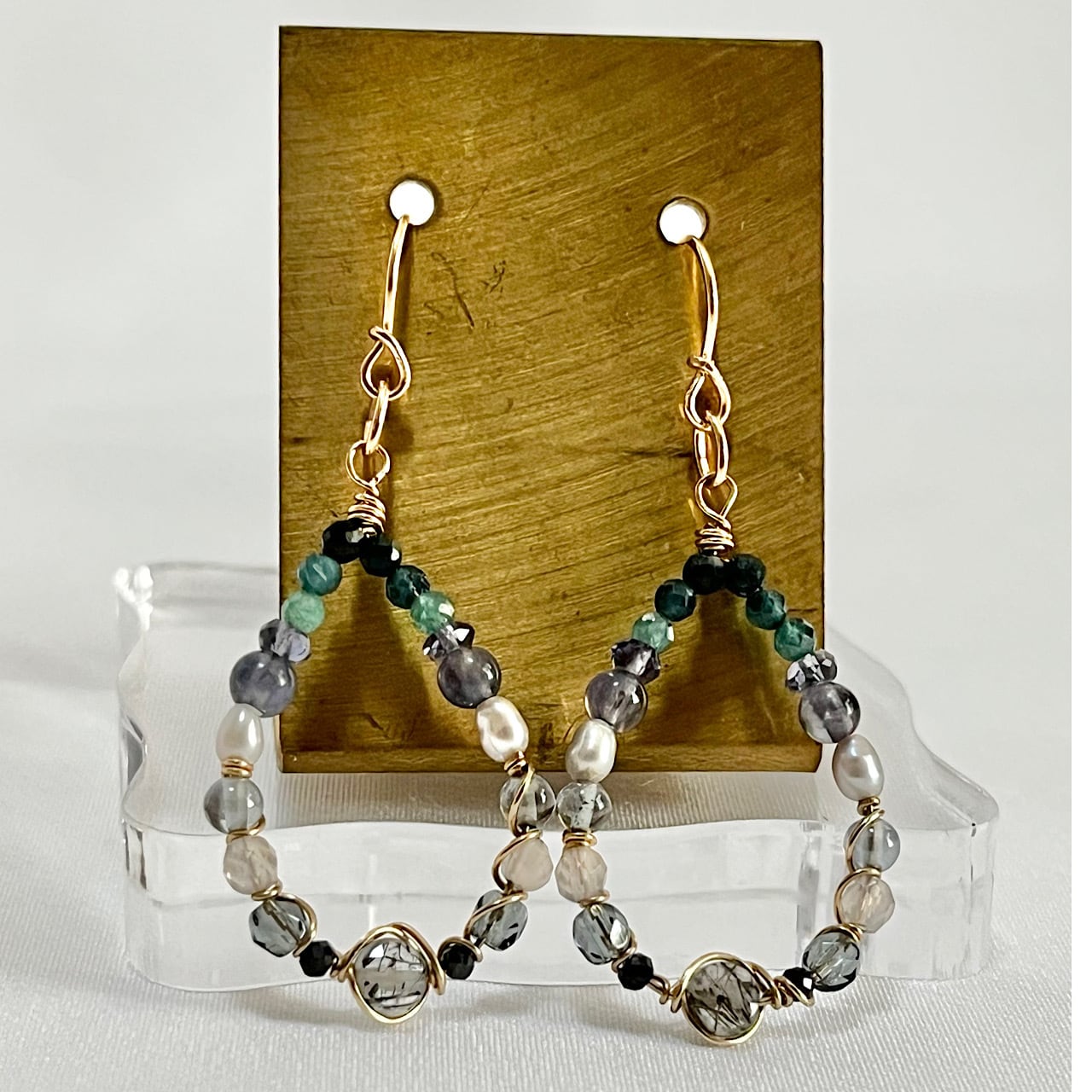 トルマリンインクォーツ(10月誕生石)、水晶、アイオライト、グリーントルマリン、淡水パール、ブラックスピネル、チェコガラス使用